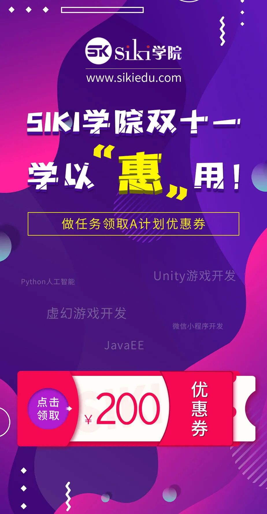 学习Unity游戏开发、虚幻游戏开发、JavaEE、Python人工智能、微信小程序开发去SiKi学院,上面有大量视频教程。www.sikiedu.com